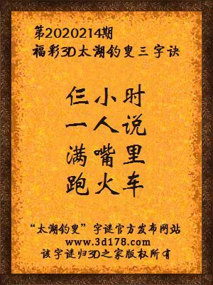 福彩第2020214期3d太湖字谜:仨小时,一人说,满嘴里,跑火车