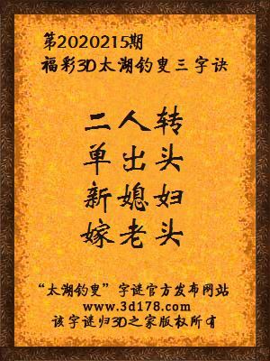 福彩第2020215期3d太湖字谜:二人转,单出头,新媳妇,嫁老头