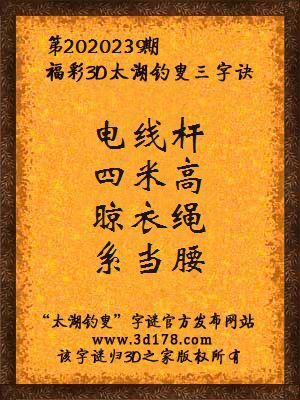 福彩第2020239期3d太湖字谜:电线杆,四米高,晾衣绳,系当腰