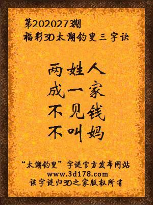 福彩第2020273期3d太湖字谜:两姓人,成一家,不见钱,不叫妈