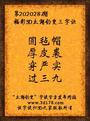 福彩第2020287期3d太湖字谜:圆毡帽,厚皮裘,穿严实,过三九