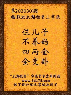 福彩第2020301期3d太湖字谜:仨儿子,不养妈,四两金,全变卦