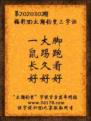福彩第2020302期3d太湖字谜:一大脚,鼠踢跑,长久看,好好好
