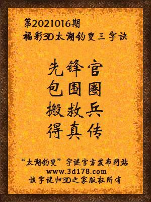 福彩第2021016期3d太湖字谜:先锋官,包围圈,搬救兵,得真传