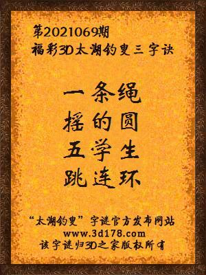 福彩第2021069期3d太湖字谜:一条绳,摇的圆,五学生,跳连环