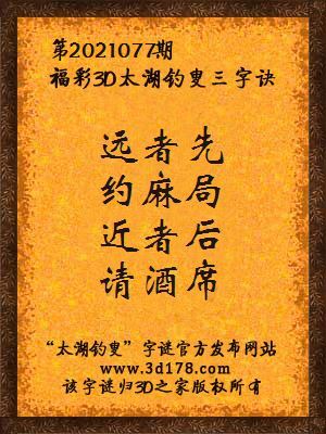 福彩第2021077期3d太湖字谜:远者先,约麻局,近者后,请酒席