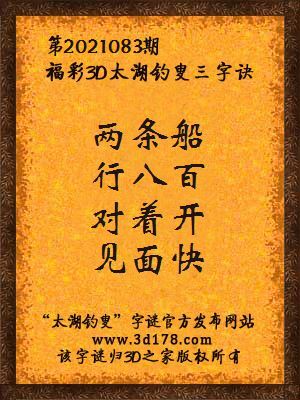 福彩第2021083期3d太湖字谜:两条船,行八百,对着开,见面快