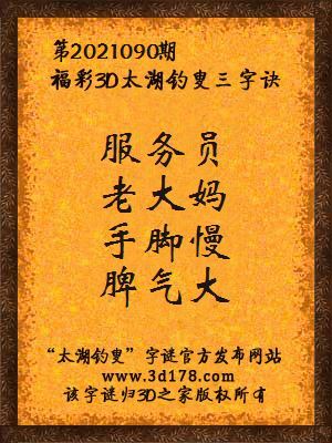 福彩第2021090期3d太湖字谜:服务员,老大妈,手脚慢,脾气大