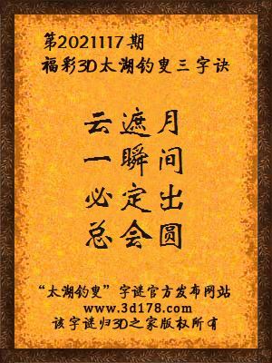 福彩第2021117期3d太湖字谜:云遮月,一瞬间,必定出,总会圆