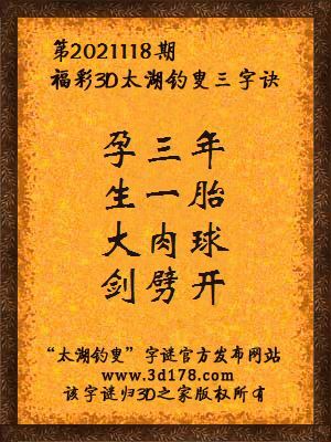 福彩第2021118期3d太湖字谜:孕三年,生一胎,大肉球,剑劈开