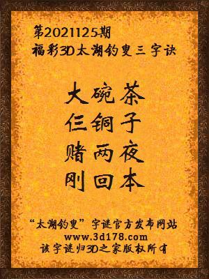 福彩第2021125期3d太湖字谜:大碗茶,仨铜子,赌两夜,刚回本