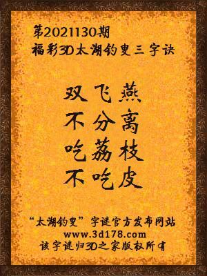 福彩第2021130期3d太湖字谜:双飞燕,不分离,吃荔枝,不吃皮