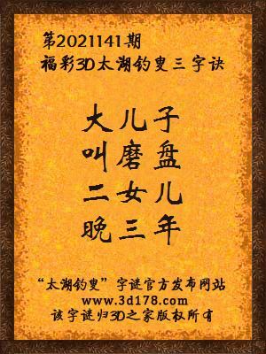 福彩第2021141期3d太湖字谜:大儿子,叫磨盘,二女儿,晚三年