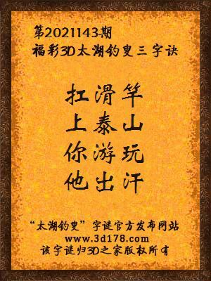 福彩第2021143期3d太湖字谜:扛滑竿,上泰山,你游玩,他出汗