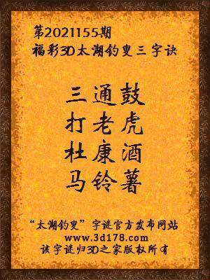 福彩第2021155期3d太湖字谜:三通鼓,打老虎,杜康酒,马铃薯