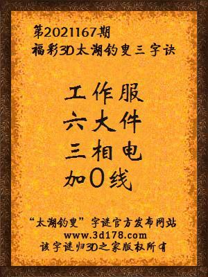 福彩第2021167期3d太湖字谜:工作服,六大件,三相电,加0线