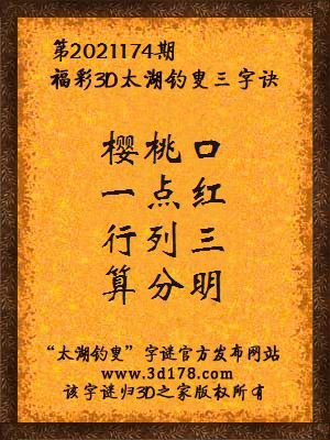 福彩第2021174期3d太湖字谜:樱桃口,一点红,行列三,算分明