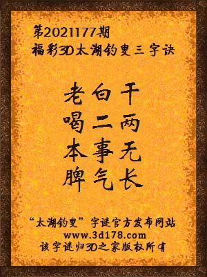 福彩第2021177期3d太湖字谜:老白干,喝二两,本事无,脾气长
