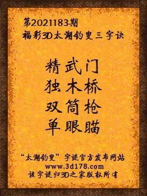 福彩第2021183期3d太湖字谜:精武门,独木桥,双筒枪,单眼瞄