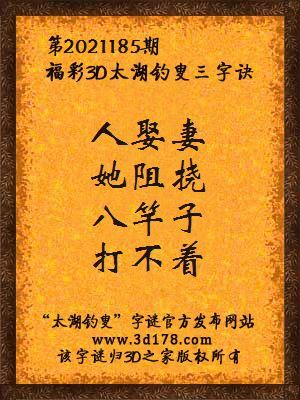福彩第2021185期3d太湖字谜:人娶妻,她阻挠,八竿子,打不着