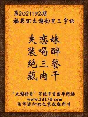 福彩第2021192期3d太湖字谜:失恋妹,装喝醉,绝三餐,藏肉干