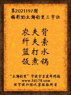 福彩第2021197期3d太湖字谜:农夫背,纤夫索,篮打水,饭煮锅