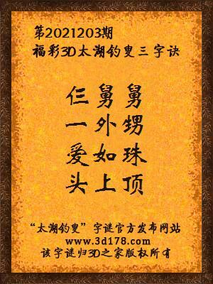 福彩第2021203期3d太湖字谜:仨舅舅,一外甥,爱如珠,头上顶