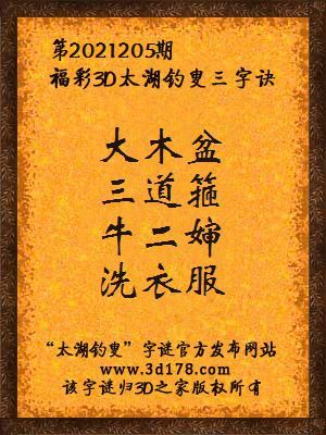 福彩第2021205期3d太湖字谜:大木盆,三道箍,牛二婶,洗衣服