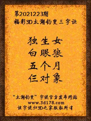 福彩第2021223期3d太湖字谜:独生女,白眼狼,五个月,仨对象