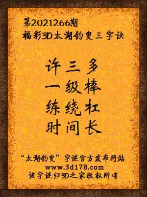 福彩第2021266期3d太湖字谜:许三多,一级棒,练绕杠,时间长