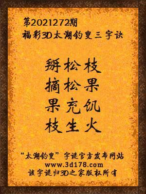 福彩第2021272期3d太湖字谜:掰松枝,摘松果,果充饥,枝生火