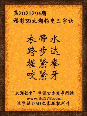 福彩第2021296期3d太湖字谜:衣带水,跨步达,握紧拳,咬紧牙