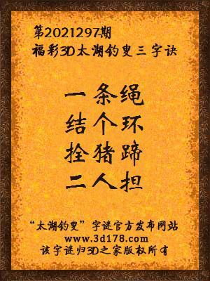 福彩第2021297期3d太湖字谜:一条绳,结个环,拴猪蹄,二人担