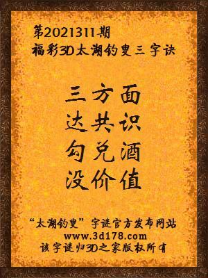 福彩第2021311期3d太湖字谜:三方面,达共识,勾兑酒,没价值