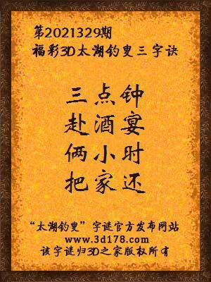福彩第2021329期3d太湖字谜:三点钟,赴酒宴,俩小时,把家还