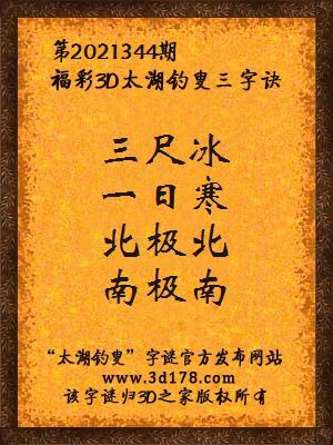 福彩第2021344期3d太湖字谜:三尺冰,一日寒,北极北,南极南