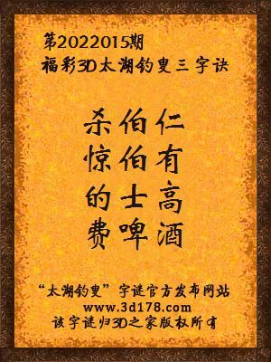 福彩第2022015期3d太湖字谜:杀伯仁,惊伯有,的士高,费啤酒