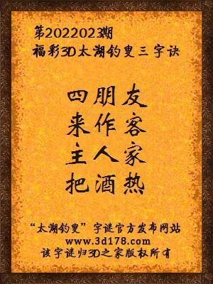 福彩第2022023期3d太湖字谜:四朋友,来作客,主人家,把酒热