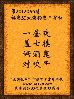 福彩3D第12065期太湖字谜:一昼夜,盖七楼,俩酒鬼,对吹牛
