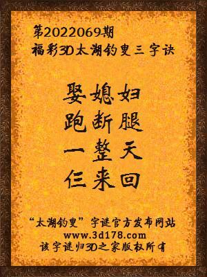 福彩第2022069期3d太湖字谜:娶媳妇,跑断腿,一整天,仨来回