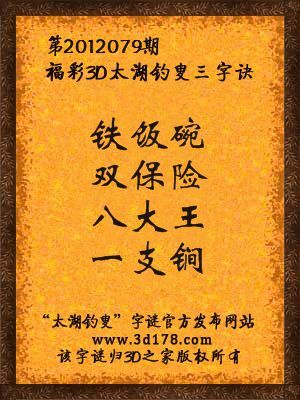 福彩3D第12079期太湖字谜:铁饭碗,双保险,八大王,一支锏