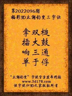 福彩第2022096期3d太湖字谜:拿双槌,擂大鼓,响三通,单于俘