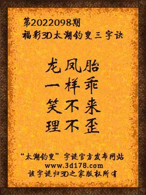 福彩第2022098期3d太湖字谜:龙凤胎,一样乖,笑不来,理不歪