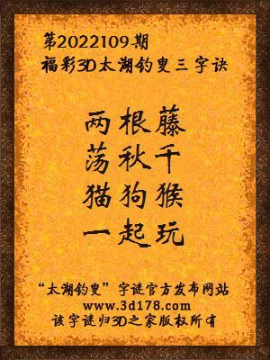 福彩第2022109期3d太湖字谜:两根藤,荡秋千,猫狗猴,一起玩
