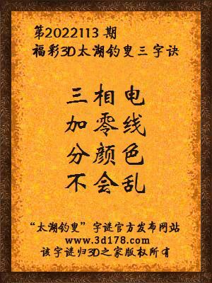 福彩第2022113期3d太湖字谜:三相电,加零线,分颜色,不会乱