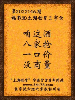福彩第2022146期3d太湖字谜:咱这酒,八家抢,一口价,没商量