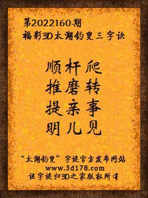 福彩第2022160期3d太湖字谜:顺杆爬,推磨转,提亲事,明儿见