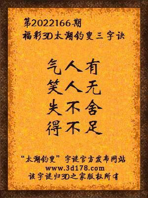 福彩第2022166期3d太湖字谜:气人有,笑人无,失不舍,得不足