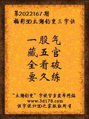 福彩第2022167期3d太湖字谜:一股气,藏五官,全看破,要久练