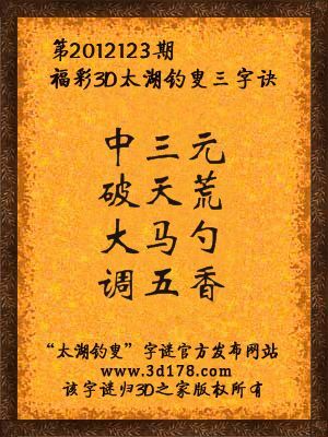 福彩3D第12123期太湖字谜:中三元,破天荒,大马勺,调五香